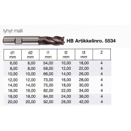 Kovametalliset 5534 jyrsimet edullisena sarjana. Sarjassa Ø 6-8-10-12-16 mm jyrsimet Jyrsimien mitat tuotteen 5534 kohdalta