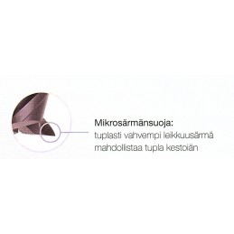 3-leikkuinen kovametallijyrsin alumiinille. Kiillotetut lastu-urat parantavat lastun poistoa Kaikissa lastu-urissa eri nousukulma: vähentää värinöitä, mahdollistaa paksumman lastun ja paremman pinnan laadun. Pieni suojaviiste parantaa kestävyyttä, kts. kuva