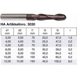2-leikkuinen pallopäinen kovametallijyrsin Jyrsimen mitat oheisessa kuvassa: D1 = halkaisija D2 = varren halkaisja L1 = kokonaispituus L2 = lastu-uran pituus L3 = max. leikkuupituus, lastu-ura+varren kevennys