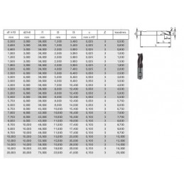 4-leikkuinen kovametallijyrsin muuttuvilla nousukulmilla, lyhyt malli. Soveltuu kaikille materiaaleille <50 HRC Jyrsimen mitat oheisessa kuvassa: D1 = halkaisija D2 = varren halkaisja L1 = kokonaispituus L2 = lastu-uran pituus L3 = max. leikkuupituus, lastu-ura+varren kevennys