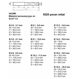 Edullinen Kobolttiseoksinen pikateräspora teräksen, ruostumattoman teräksen, valuraudan, alumiinin ja muiden ei-rautametallien ja muovien poraamiseen Poran mitat oheisessa kuvassa