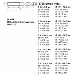 Edullinen Kobolttiseoksinen pikateräspora teräksen, ruostumattoman teräksen, valuraudan, alumiinin ja muiden ei-rautametallien ja muovien poraamiseen Poran mitat oheisessa kuvassa