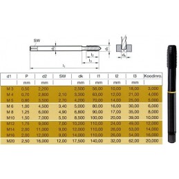 Yleiskierretappi kaikille metalleille. Soveltuu erityisesti teräksille vetolujuudet alle 1000 Nm ja RST-teräksille Osta 2kpl samaa kokoa - säästät 15% Kuvan taulukossa mitat.