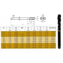 Yleiskierretappi kaikille metalleille. Teräksille, vetolujuudet alle 1000 Nm Ruostumattomille teräksille Alumiinille HSS-E-PM pulveripikateräs yhdessä TiN pinnoitteen kanssa - maksimaalinen kestoikä HUOM! 50° nousukulma vaatii koneelta hyvää synkronointia Osta 2kpl samaa  kokoa - säästät 15% Kuvan taulukossa mitat.